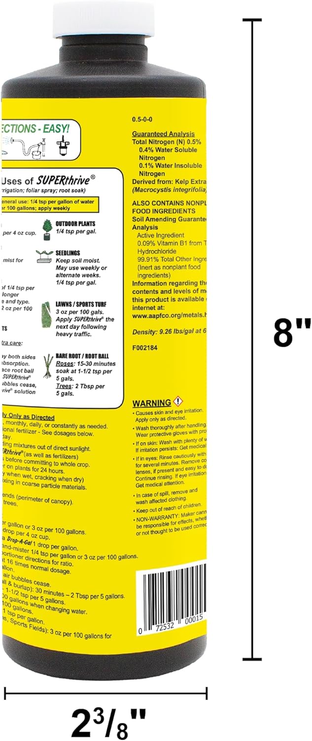 • Superthrive Is a Highly Concentrated Non-toxic Vitamin Solution Invigorating All Variety of Greenery for Home Gardeners and Professionals Alike; It Is Equally Suited for Hydro-seeding, Hydroponics, and Foliar Spraying