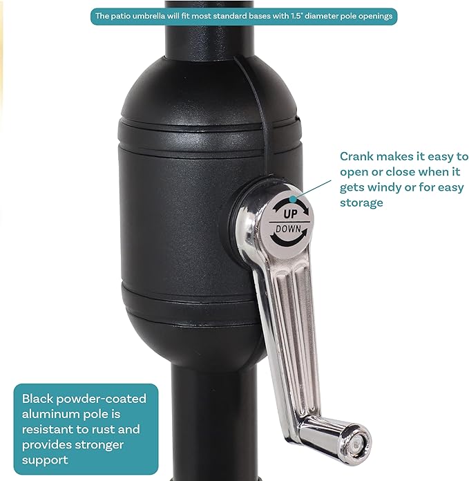- DURABLE DESIGN: This tilt patio umbrella is made with a durable 100% polyester fabric shade with steel ribs for added stability. The pole features a powder-coated aluminum construction for resistance to rust and stronger support.