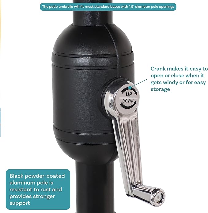 - PROVIDES OPTIMAL SHADE: This outdoor table umbrella measures 9' in diameter x 8' H overall and has a 1.5" diameter pole. It provides ample shade for 42-54" tables to keep outdoor spaces cool and comfortable. The crank is 45" H from the ground.