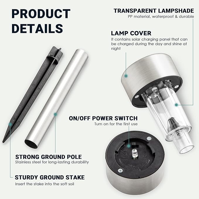 • Two Minutes Project: One minute to assemble the parts (turn the switch on before assembling) and another minute to insert it into ground, then it works in your garden, porch or yard