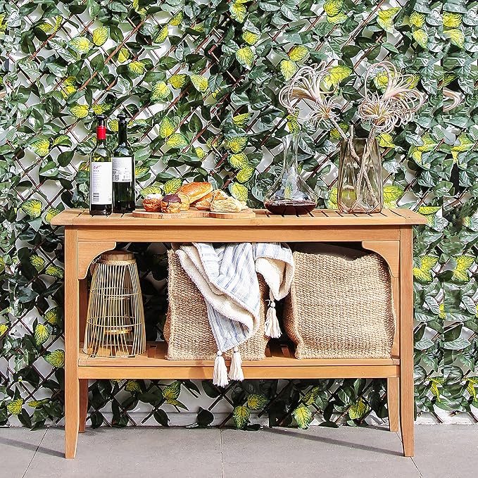 - MULTIPLE FUNCTIONS: Make this a helpful self-serving buffet table for an al fresco party. Also decorate your space with this console table an outdoor essentials piece.|SPACIOUS STORAGE SPACE: This patio console table has lower shelf for additional storage space for your outdoor must-haves.|SLENDER DESIGN: This narrow console table is perfect for small spaces offering a compact design that takes up minimal room.|DURABLE TEAK FURNITURE: Crafted carefully with superior Indonesian teak strong and robust wood that is famous for its natural teak grain bring exotic vibes to your patio.|VERSATILE STYLISH DESIGN: This farmhouse-style inspired collection is chic and welcoming at the same time.|WEATHER-RESISTANT: Teak wood is long known for its resistance against outdoor elements.|QUICK EASY ASSEMBLY: We guarantee a simple process consisting of only a few parts to assemble with a clear step-by-step instruction manual. |MIX MATCH: Make good use of your creativity by matching prominent pieces from the Caterina collection to accompany this teak table. No need to go through the hassle of going through millions of random pieces online to make a harmonious patio set for your home as we have matching pieces ready for you.|Items must be returned in their original shipping box along with any accessories manuals and must be in a resalable condition.|A copy of your purchase receipt must be included.|You are responsible for return shipping - unless the order was fulfilled incorrectly by Cambridge Casual.|We must receive the items at our warehouse within 30 days of the original delivery date.