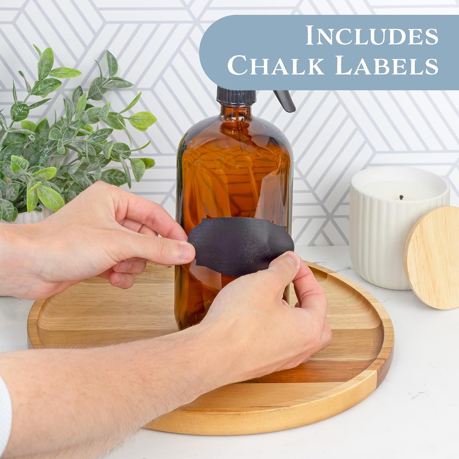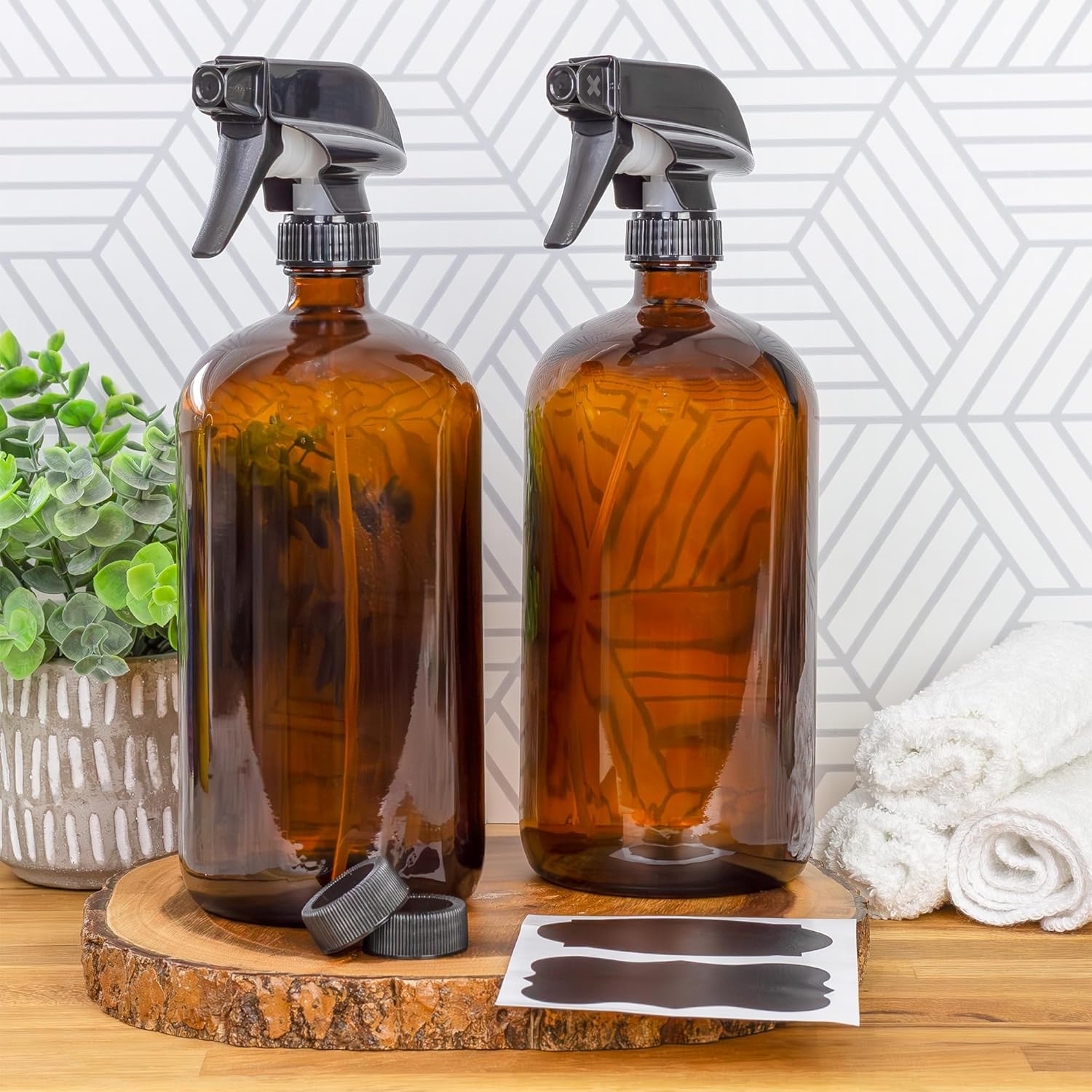 • AMBER GLASS BOTTLES: Glass bottles are safest for aromatherapy & essential oils to maintain their purity. Amber color provides protection to contents from ultraviolet light. VALUE 2-PACK: You get two 32-ounce amber glass bottles, 2 trigger sprayers with 3 settings, 2 spare lids for storage & transport
