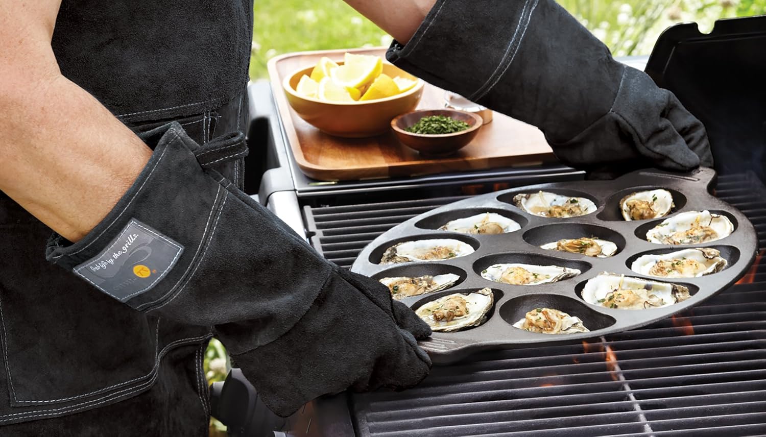 • Protects hands and wrists from the heat, flames and sparks when grilling