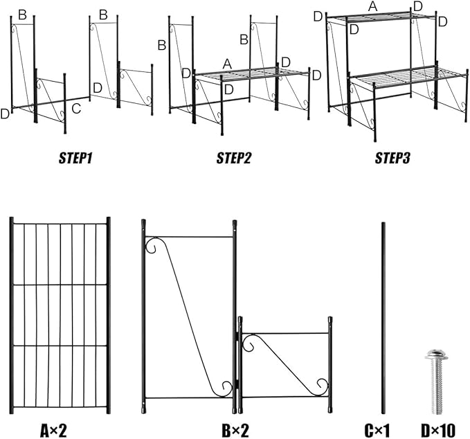 • Space saving indoor outdoor design with black metal frame and 2 iron style shelves, organize your garden and life. Simply assemble without any tools. For installation instructions, please refer to the picture on the left