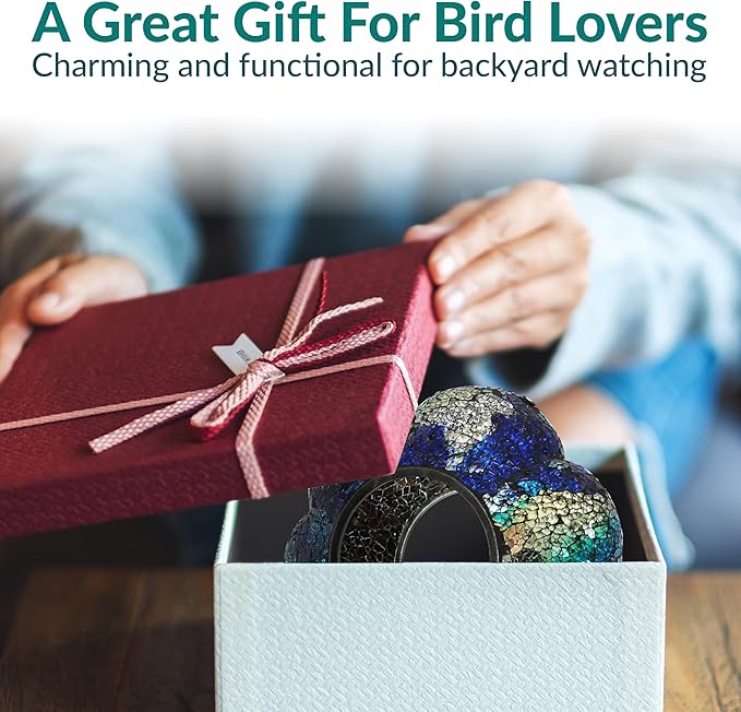 • ATTRACT BIRDS TO THE YARD: The backyard bird feeder is made of glass in the shape of flower. It features a beautiful deep blue color with speckles of turquoise and yellow.