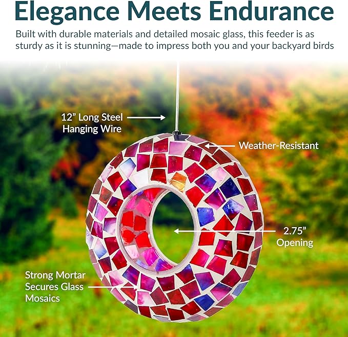 - ATTRACT BIRDS TO THE YARD: This cute bird feeder features vibrant colors and a mosaic glass construction that is sure to appeal to humans and birds alike. The bright colors and reflective material will help attract a variety of bird species to the feeder including cardinals, finches, sparrows, and more. Plus, it will add a stylish pop of color to any patio decor. The open fly-through design also makes it easier for birds to access the seed, encouraging them to come back again and again.