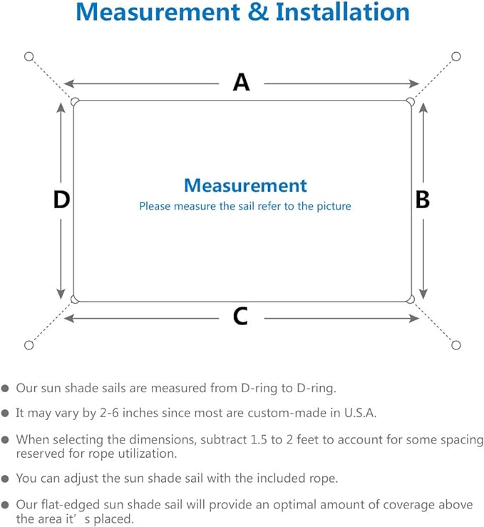 - Easy to Install and no maintenance needed: Leave a 1-2 ft space between your fixed point and the shade sail to easily fit hardware or rope. Connect the other ends of cables to existing poles, trees or wall with shade sail ropes included or hardware kits, whichever works best for you.