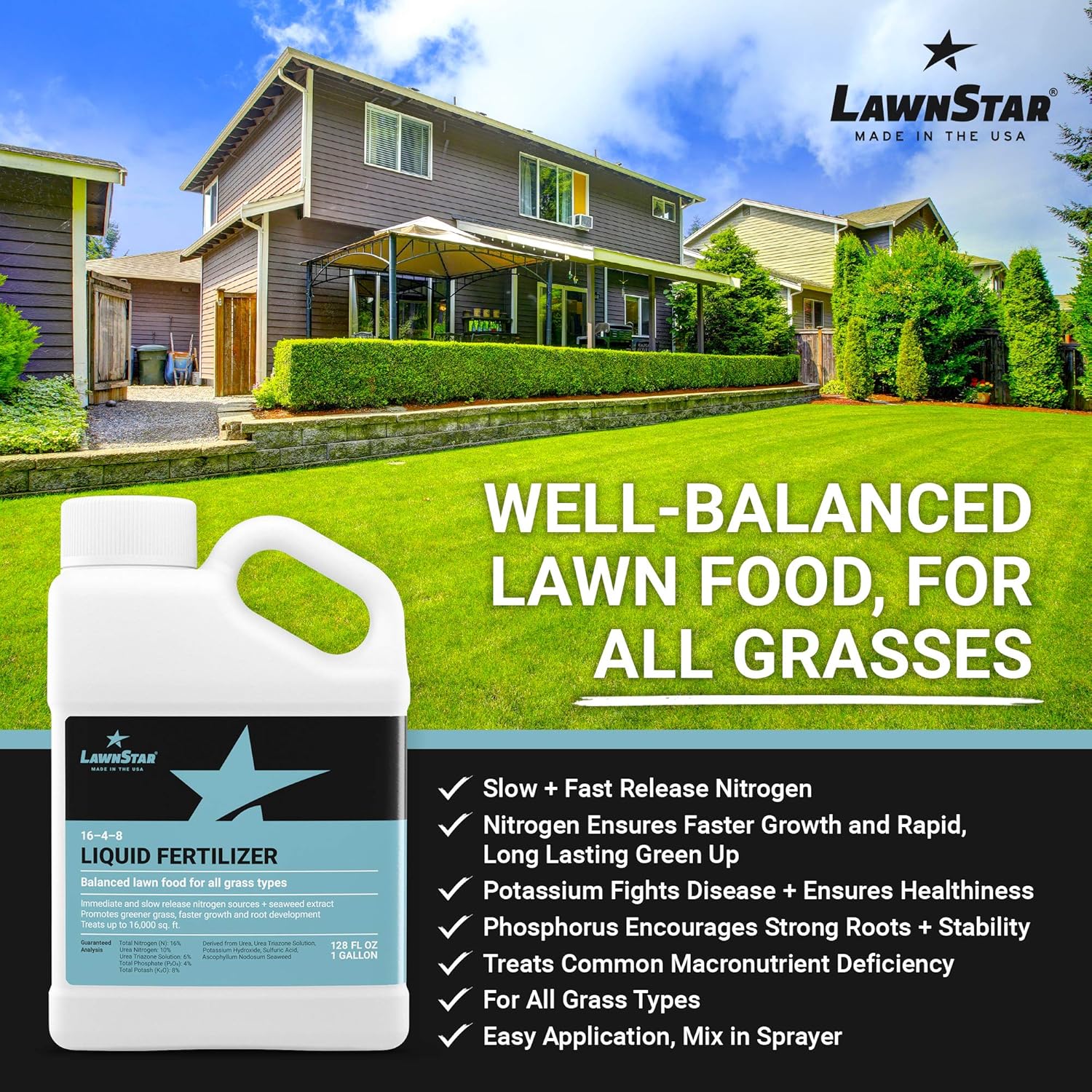- BALANCED LIQUID LAWN FOOD FOR ALL GRASS TYPES: LawnStar Premium 16-4-8 delivers a well balanced troop of the macronutrients (Nitrogen, Phosphate and Potash) your lawn needs during the spring & summertime!