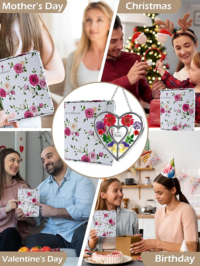 KY&BOSAM Heart Suncatcher Faith Stained Glass Hangings for Windows Sun Catchers Birthday Gifts for Women Real Flower Glass & Metal Maker for Christmas Tree Wedding Party Patio Home Garden Decor
