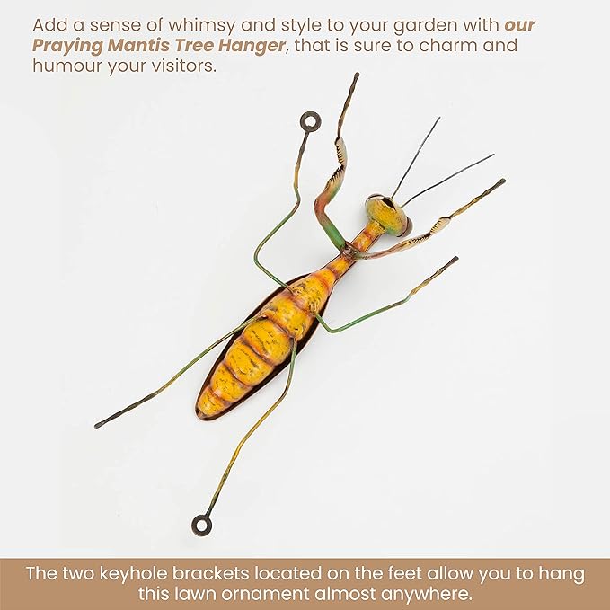 - Yard Decorations: A charming way to add a sense of whimsy and style to your garden, our Praying Mantis Tree Hanger will charm and humor your visitors. This piece is a perfect outdoor tree decoration
