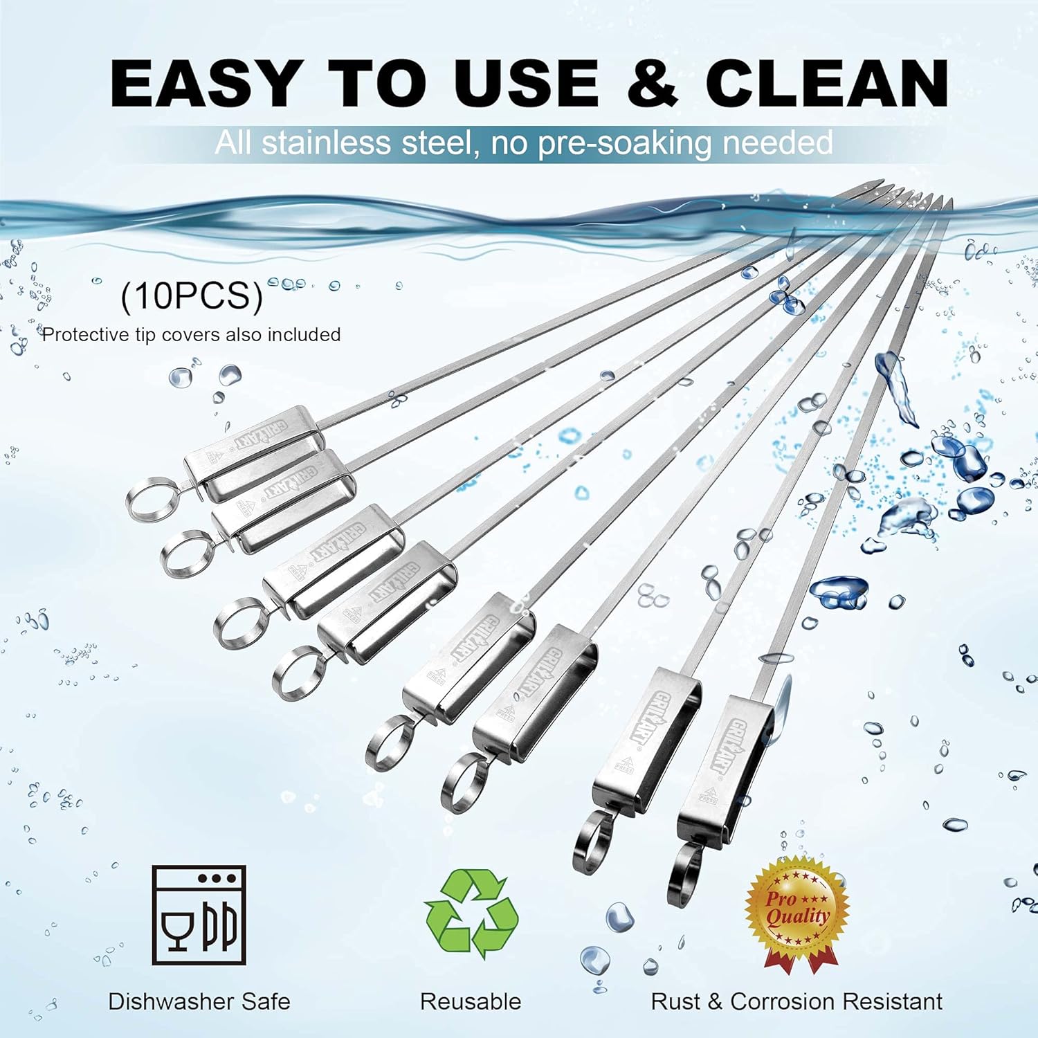 - 【10PCS never rust quality & lifetime customer service】Made of top-of-line thick stainless steel, never rust/bend/break, literally built to last a lifetime. 10PCS quantity suitable for each of your BBQ party, reusable feature & long-lasting quality ensure per your penny spent on this BBQ skewers for grilling BBQ stick is worthy. Surely, if ever needed, after-sales service is always available, totally risk free. Just consider buying 2, one for you, and one for your best friend. (Dishwasher safe)