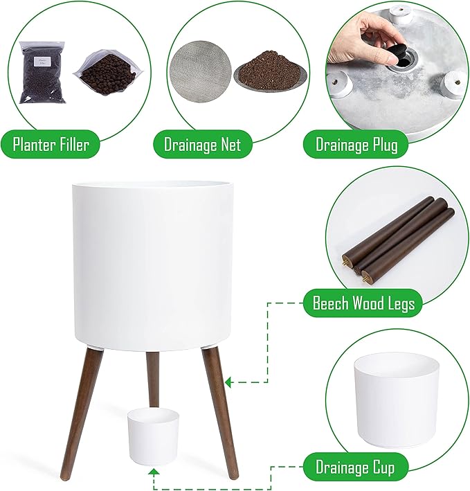 • What’s included: planter pot with drainage hole, set of stand – 3 solid wooden legs.