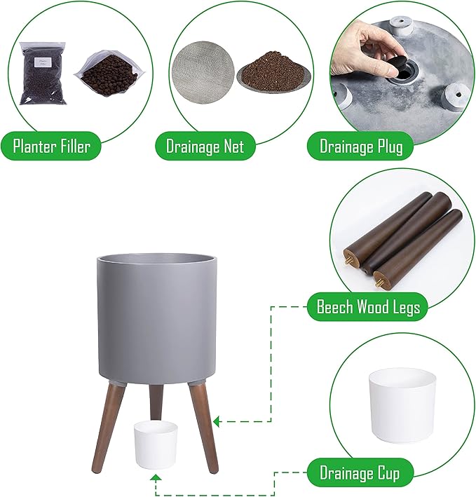 • What’s included: planter pot with drainage hole, set of stand – 3 solid wooden legs.