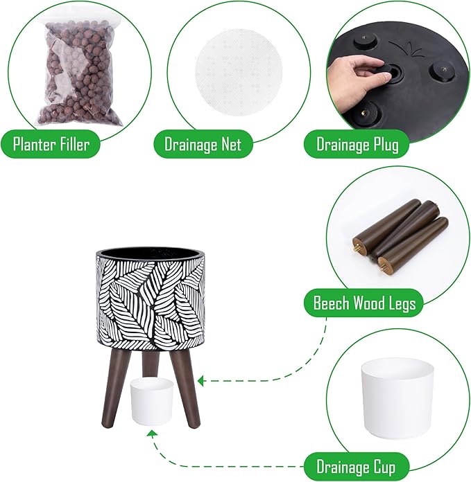 • What’s included: planter pot with drainage hole, drainage plug, set of stand – 3 solid wooden legs.