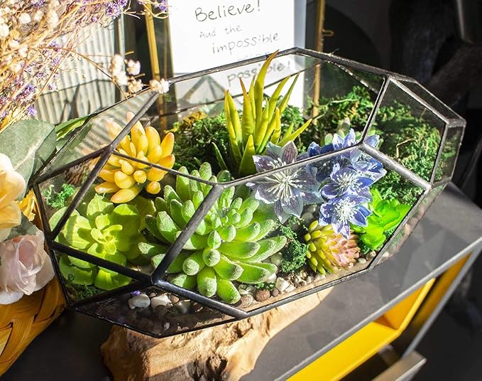 Ferrisland Handmade 10" Large Glass Terrarium Irregular Geometric Planter Indoor Air Plants Holder Window Balcony Display Succulent Flower Pot, Black