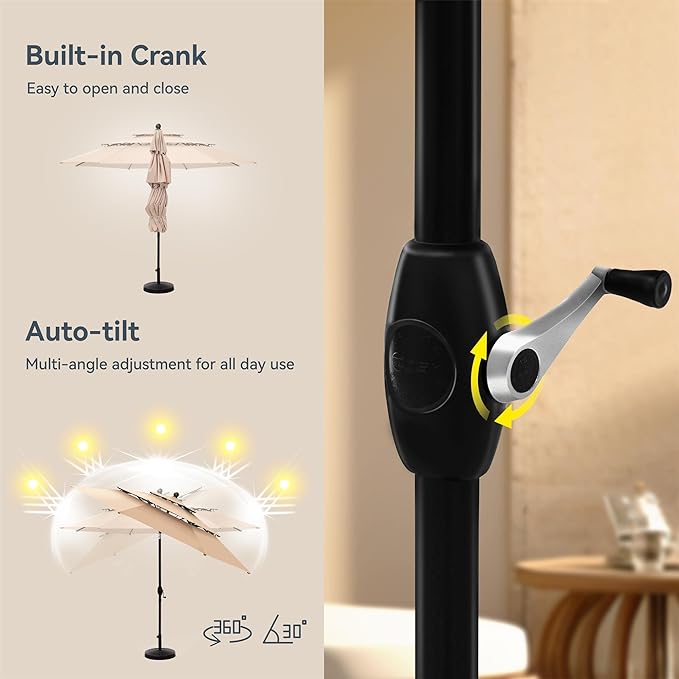 - Auto- tilt Umbrella: Humanized design with crank and tilt mechanism, using the handle up and down to control the opening and closing of the umbrella. Easily adjusting your umbrella to block the sun’s rays at any angle with Auto button tilt