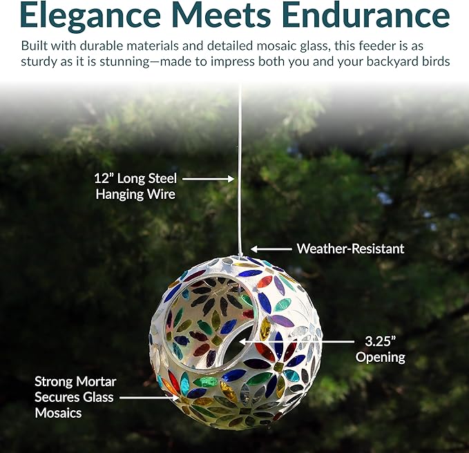 - EASY TO FILL: The 3.25" diameter opening can be accessed from two sides, making it easy to fill the glass hanging bird feeder with seeds. The small drainage hole in the bottom of the mosaic bird feeder helps to keep seed dry and prevent moisture from building up. The mesh tape placed over the hole allows moisture to drain without spilling the seeds. It holds approximately 1 cup of small birdseed blend. Please note that the amount of food may vary depending on the type of seed you use.