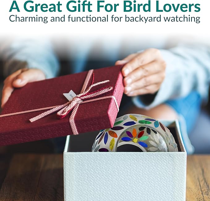 - ATTRACT BIRDS TO THE YARD: This cute bird feeder features vibrant colors and a mosaic glass construction that is sure to appeal to humans and birds alike. The bright colors and reflective material will help attract a variety of bird species to the feeder including cardinals, finches, sparrows, and more. Plus, it will add a stylish pop of color to any patio decor. The open fly-through design also makes it easier for birds to access the seed, encouraging them to come back again and again.