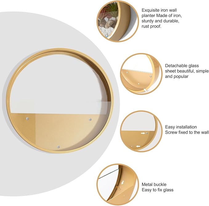 • Round metal hanging wall planters with glass baffle to display small plants, succulents, or faux greenery