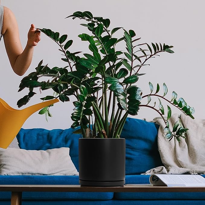 D'vine Dev 8 Inch Ceramic Planter Pot with Drainage Hole and Saucer, Indoor Cylinder Round Planter Pot, Black, 94-O-D-2