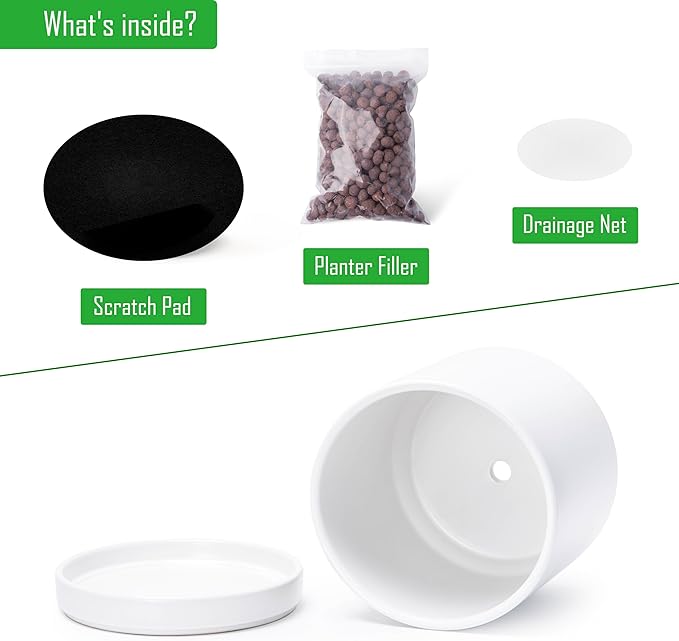 • Planter pot with drainage hole, mesh drainage net and protective scratch pad included.
