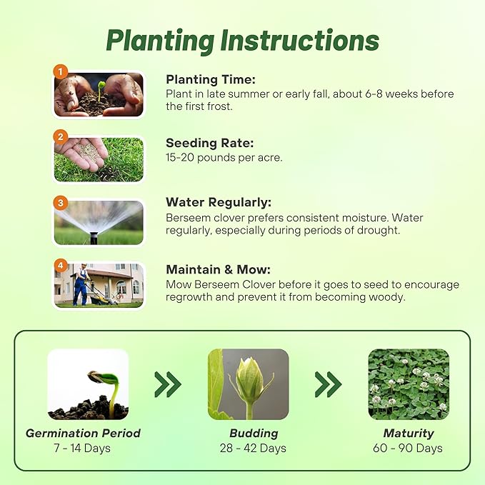 - DENSE COVERAGE WITH OPTIMAL SEEDING RATE – With a recommended seeding rate of 15-20 pounds per acre, our Berseem clover grass seed ensures thick, lush growth across fields and food plots. This high-yielding clover seed provides effective coverage, reduces erosion, and is ideal for ground cover alternatives to grass, microclover lawns, and pollinator-friendly gardens.