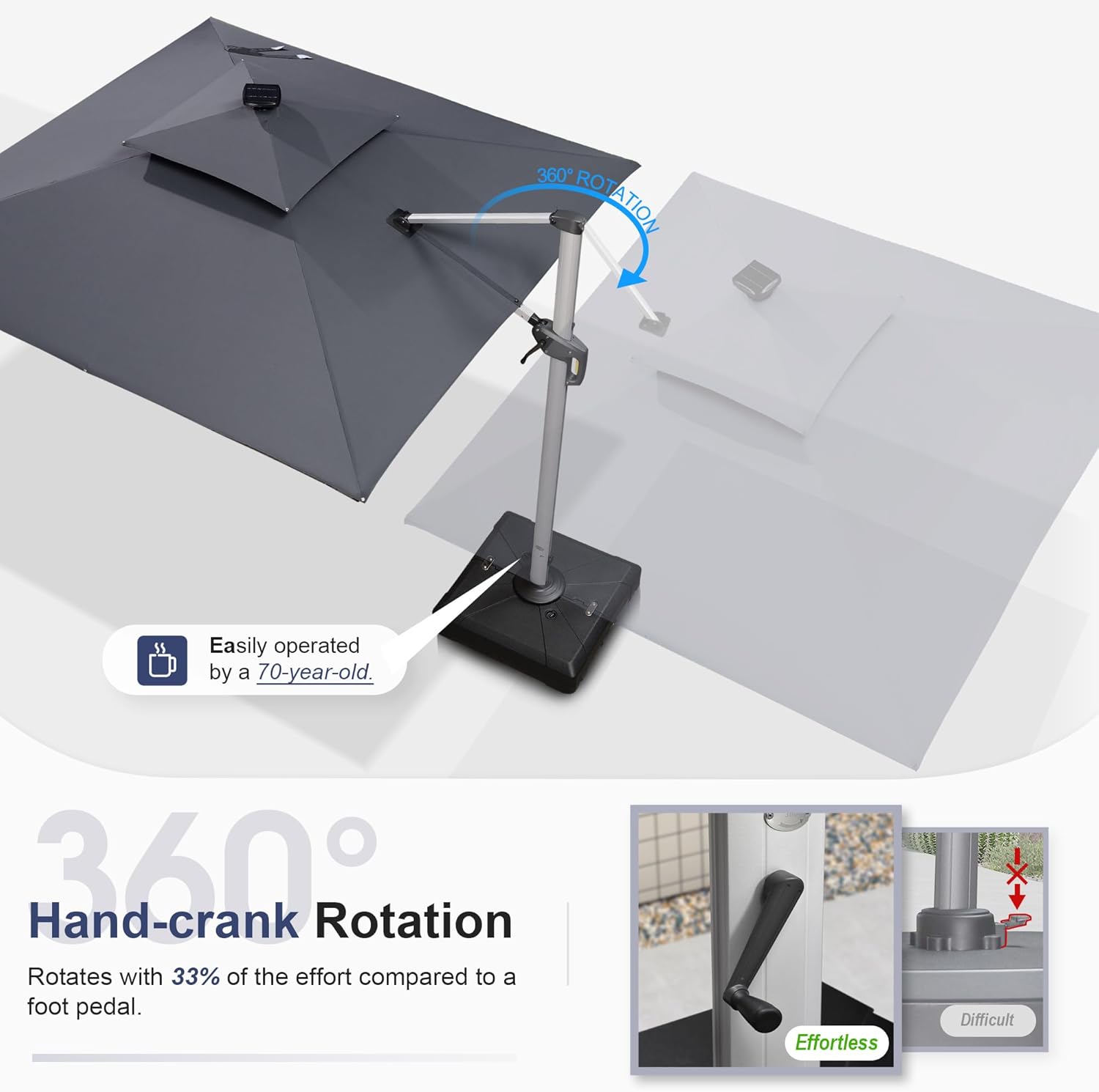 - Multi-function adjustment: Unique handle design and crank system, 6 height and angle to choose, 360 degree rotation for easier shading area control