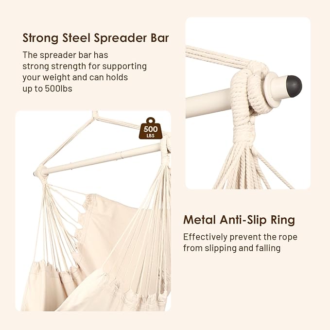 - ▶ SAFE & STRONG - Sturdy Steel Spreader Bar makes the hammock swing more stable, its Anti-Slip Rings can effectively prevent the rope from slipping. It has strong strength for supporting your weight and can holds up to 500lbs.