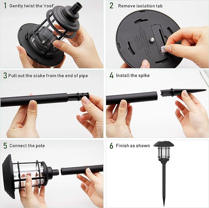 - Easy to Assemble & Install: NO WIRES. These solar garden lights can be done in a few minutes. Just connect the parts and stake into the ground where there is sun shines. For your convenience, we provide the rechargeable batteries.
