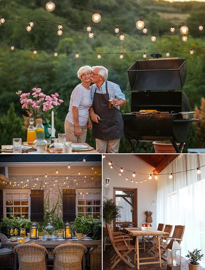 - 【Dimmable Compatible & Energy Saving】G40 outside string light come with 25 glass bulbs and 1 spare bulb. 1.5 inch light bulbs have E12/C7 candelabra socket base, 5W per bulb, warm white dimmable string light help you to save more electricity bill.