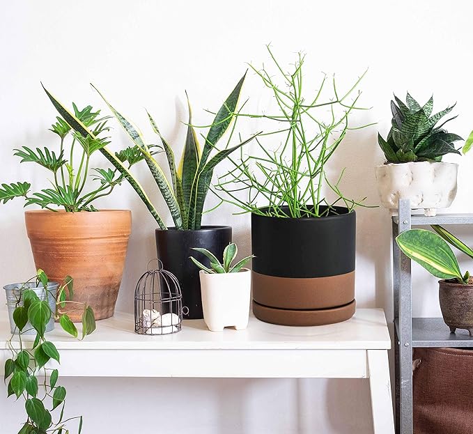 D'vine Dev 6 Inch & 8 Inch Ceramic Planter Pots for Plants with Drainage Hole and Saucer, Medium Plant Pots Set, Black/Speckled Tan, 94-G-M-7