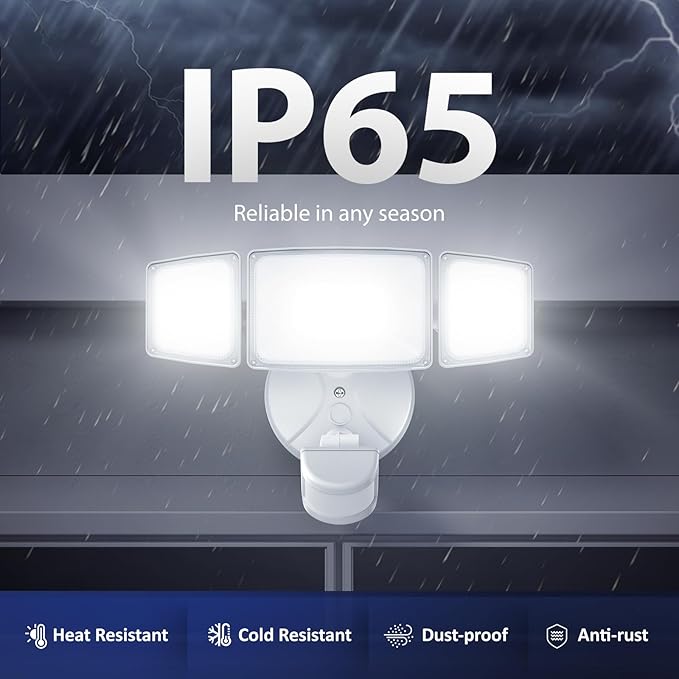 - IP65 WATERPROOF: IP65 waterproof rating ensures that your outdoor security light fixture won't be damaged in rain, sleet or snow weather; Perfect for garages, workshops, yards, storage rooms, driveways, parking lots, and more