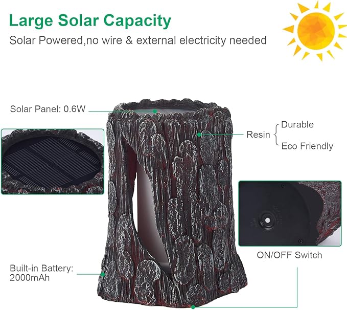 • 【NO INSTALL NEEDED】Just turn the switch on, put it under sunlight, the “Stump” will automatically on fire in the night