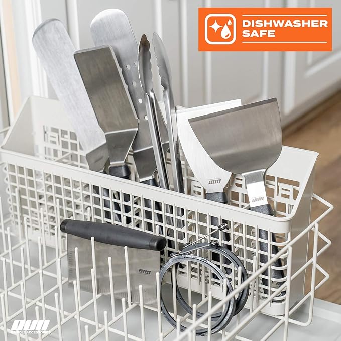 - ⭐ Pack It Away! All your tools are Dishwasher Safe! Once clean, store them away in your 18x9” Griddle Accessories Case. With a double carry handle and wide opening, it fits everything! – tongs, griddle spatula trio, burger spatula metal chopper, egg cooker ring, scraper n scrubber, and squeeze bottle duo. So why not try out The OUII Flat Griddle Set now… because delicious food starts right here!