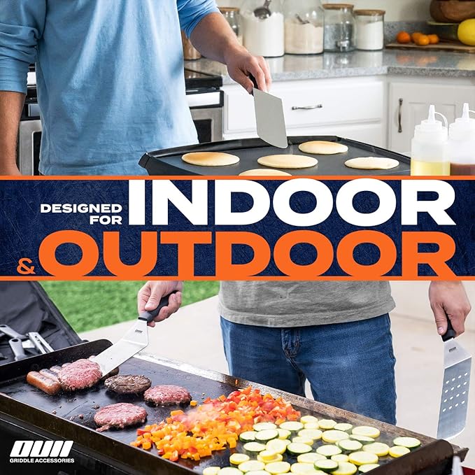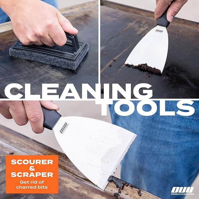- ⭐ Now, Get It Clean: Efficient Cleaning Tools for the kit! 1x Heavy Duty Griddle Cleaner Scourer with strong handle and 1x griddle scraper with comfy heat resistant handle and sharp rust-resistant stainless steel blade. Everyone knows you can’t create a tasty burger, crispy hash browns or tasty cuisine on a grimy griddle. So OUII created a set of flat grill tools that cooks delicious food from start to finish!