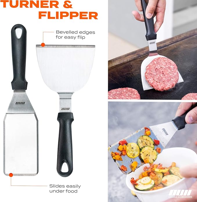 - ⭐Premium 14pcs BBQ Griddle Accessories! This kit has everything you need for an amazing cookout. You’ll get 3 purpose-made spatulas 1x Long Spatula (14.5''), 1x Slotted Spatula (14.5'') and 1x Beveled Spatula (11.7'') 1x pair of 12’’ Locking Tongs to ensure you have all the metal spatulas for cooking furiously fast food life at the griddle.