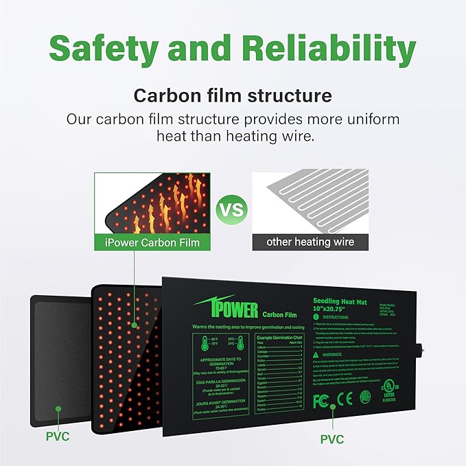 • Heating Film Structure: Upgraded heating film ensure uniform heating. Warms root area 10-20℉(5-11℃) over the ambient air temperature, which will increase the success of seedlings and cuttings.