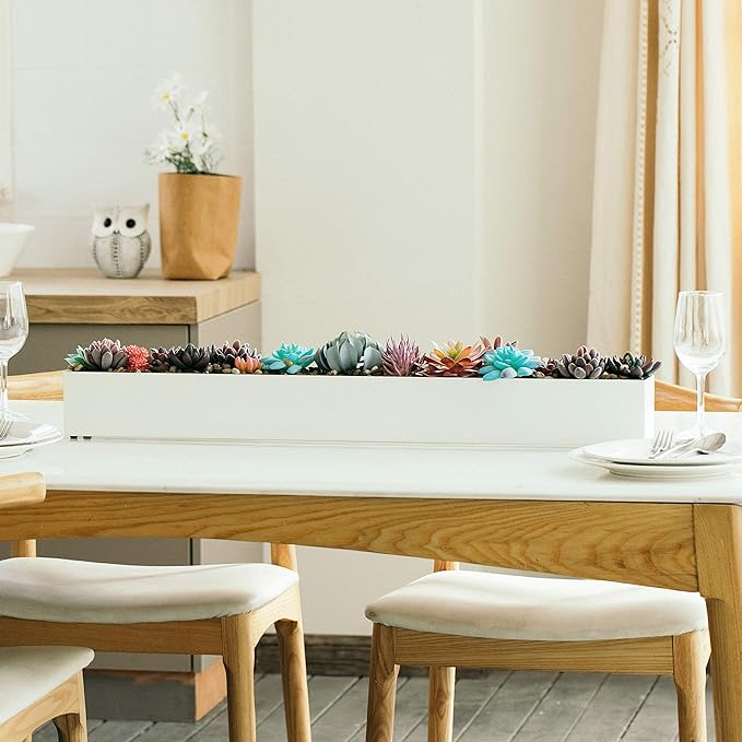 - Modern room decor: Our stylish rectangular planter box makes a decorative statement on its own. It is simple yet elegant. This minimalist design has been powder coated with a pure white easy to clean finish. This finish is resistant to scratches, chips and fading. It is perfect to elevate and blend into any home dรฉcor! Please note that plants and rocks are not included.