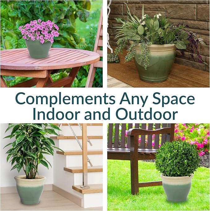 - VERSATILE PLACEMENT: Use this round garden planter on the patio, deck, or porch to add flowers to outdoor spaces, or set the planter in the sunroom, living room, or dining room to bring life to indoor spaces. If using it indoors, place a saucer (not included) beneath the flowerpot to prevent water and soil from leaking on the floor. The drainage in the bottom of the pot provides optimal air circulation and prevent water from pooling.