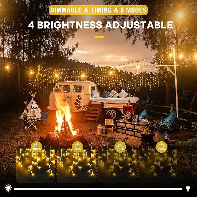 - 8 Lighting Modes & Timer Function: Icicle Christmas lights with 8 different light patterns: Combination, In waves, Sequential, Slo-Glo, Chasing/Flash, Slow fade, Twinkle/flash and Steady on. Different modes represent different moods. Our icicle lights also have timing function, which automatically turns on for 6 hours and turns off for 18 hours