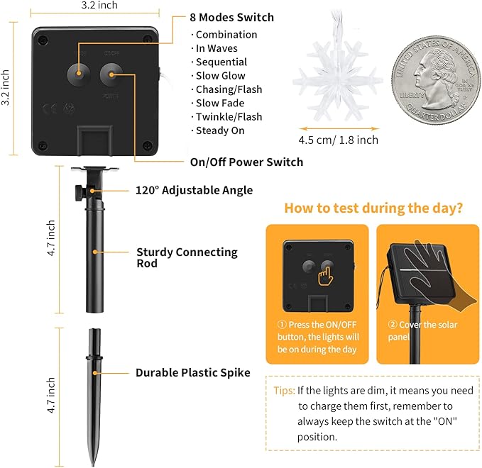 - 【Multi-Modes LED Outdoor Lights】The solar outdoor lights are built with 8 lighting modes: Combination, In waves, Sequential, Slo-glo, Chasing/Flash, Slow Fade, Twinkle/Flash and Steady On; The snowflake light string can meet your needs, you can adjust different lighting modes according to your mood.