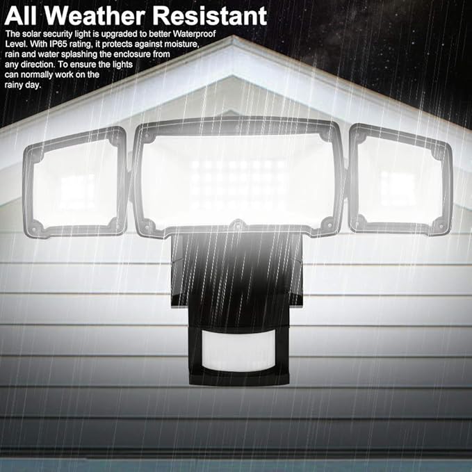 - Security & All Weather Resistant - The robust housing and impact-resistant PC lens ensures this 3 head security light fixture can stand up to the elements and bad weather. IP65 waterproof rating ensures that your 3 head security light fixture won’t give in in rain, sleet or snow weather. It's specifically designed to withstand extreme weather conditions, all weather resistant and provide additional safety and security for your home.