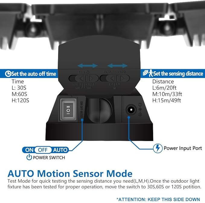 - Smart Motion Sensor - The solar light has daylight and motion sensor. The AUTO MODE (Dusk to dawn) Auto ON for pre-determined time(30S/60S/120S) when people or other living objects are detected within the sensing area, and Auto OFF after no further motion is detected. Built-in PIR motion sensor of our solar lights, it has a long range of distance and a wide angle for motion detection. Sensing range and sensitivity are both 20% higher than general solar lights, bringing ultimate using experience.