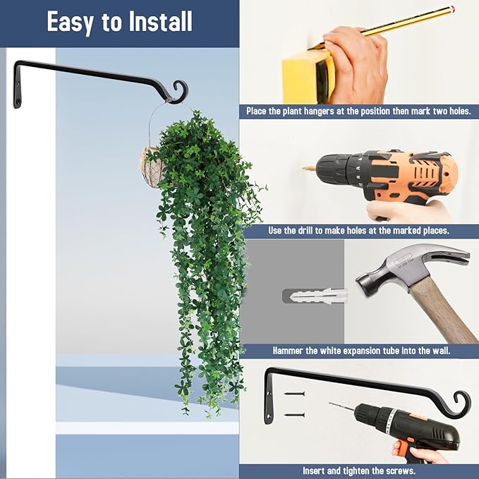 - 【EXCELLENT QUALITY】:The decorative plant hanging bracket is 4 inches in height and 12 inches from the wall, the screw length is 1.6 inches, making it suitable for hanging your favorite indoor and outdoor decorations. These hanging plant hooks are made of high-quality iron and coated with powder,they are rust and corrosion resistant. Premium quality makes them sturdy.