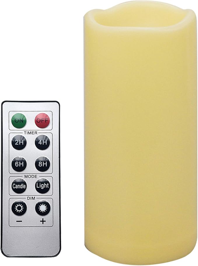 - 【Easy to use with remote】The remote has a 10-20 foot range. You can use the remote control to turn on and off the flameless LED candle, set the timer (2H, 4H, 6H and 8H daily cycle timers are available), select the mode (flickering or steady light) or choose the brightness level. Set 4H timer, the candle light stays on for 4 hours and turns off automatically for 20 hours and then on again itself on the second day.