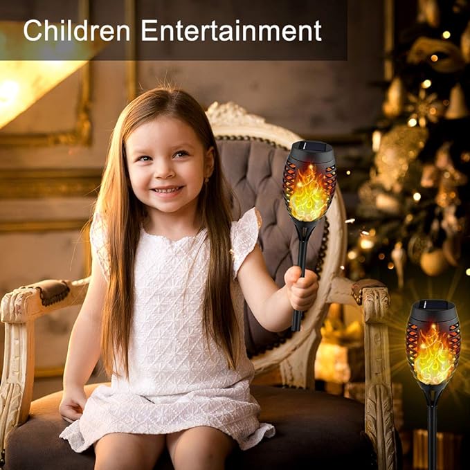 - Torch Lights Flickering Flame: Solar outdoor lights flicker a soft and mod-enhancing "Real" flame for outdoor decorations for patio, garden, yard, porch, pool decor and for party, camping, barbecue, wedding, christmas, halloween decor.