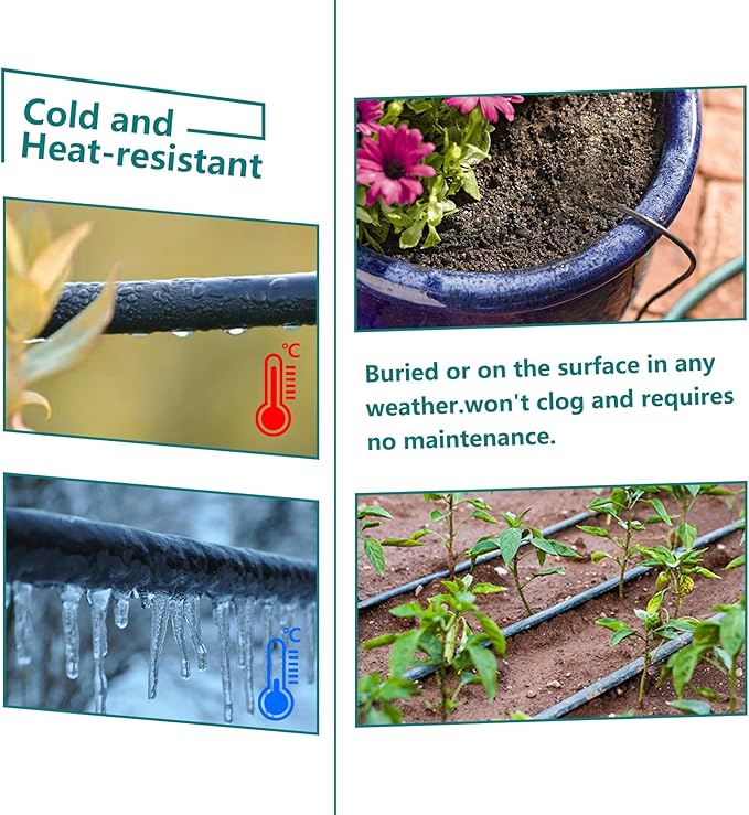 • 【HIGH QUALITY MATERIAL】The Irrigation Tubing is made of PVC material, very soft,leak-proof,UV resistance.Cold and heat-resistant,buried or on the surface in any weather.won't clog and requires no maintenance
