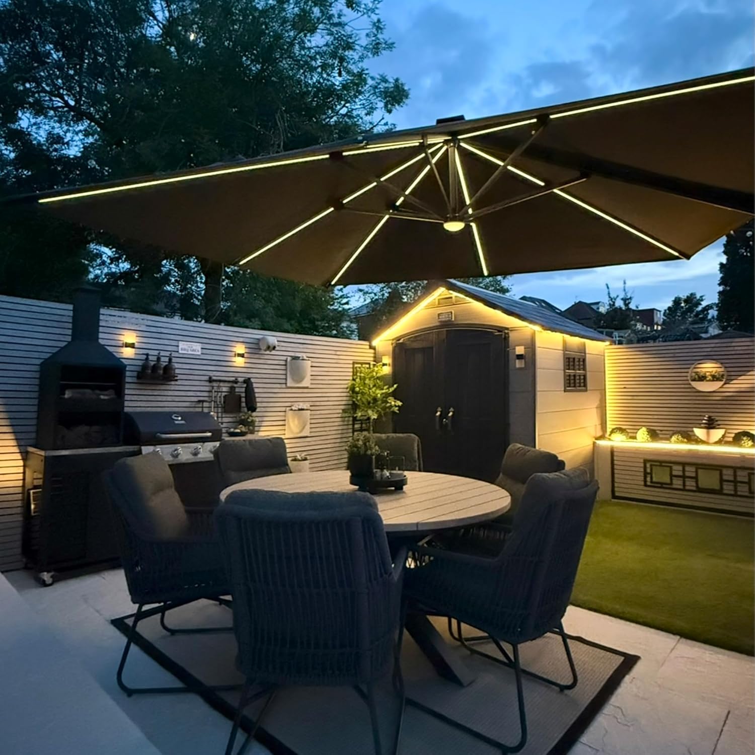 - Powder coated all-aluminum umbrella bones and 8 heavy-duty ribs and comes with led lights that is powered by a solar panel on top, design for durability and enjoyment for outdoor use