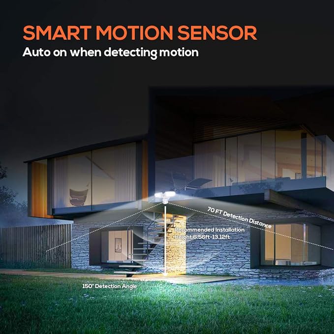 - 【IP65 WATERPROOF & DURABLE】IP65 waterproof rating ensures that your motion-activated flood light won’t give in in rain, sleet, or snow weather. It's specifically designed to withstand extreme weather conditions, all-weather resistant and provides additional safety and security for your home. More durable aluminum design provide the product a good heat dissipation function, the outstanding lifespan of 50,000 hours can effectively reduce the frequency of replacing fixtures.