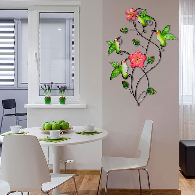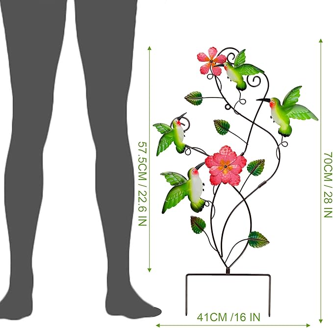 - Hummingbirds Garden Stake Decor: 28 Inch height garden ornaments features multiple eye-catching bright 4 green hummingbirds with 2 pink flowers and green leaves. Place the colorful vivid metal decorative stake in your garden, yard or anywhere you want, it will bring more refreshing feel of nature.